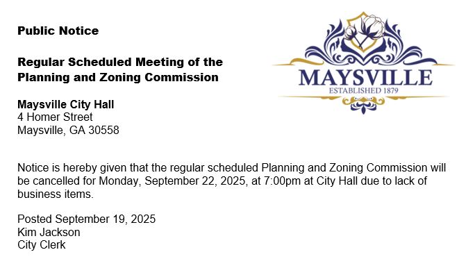 Regular Scheduled Planning & Zoning Meeting, Monday September 22, 2025, Cancelled