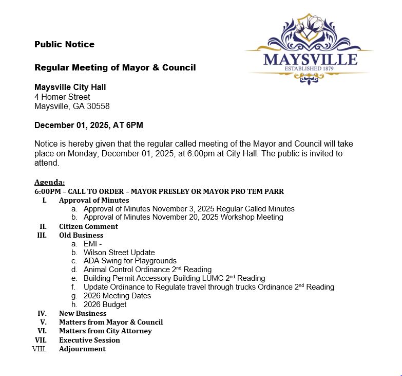 Mayor and Council will have a regular scheduled meeting December 1, 2025